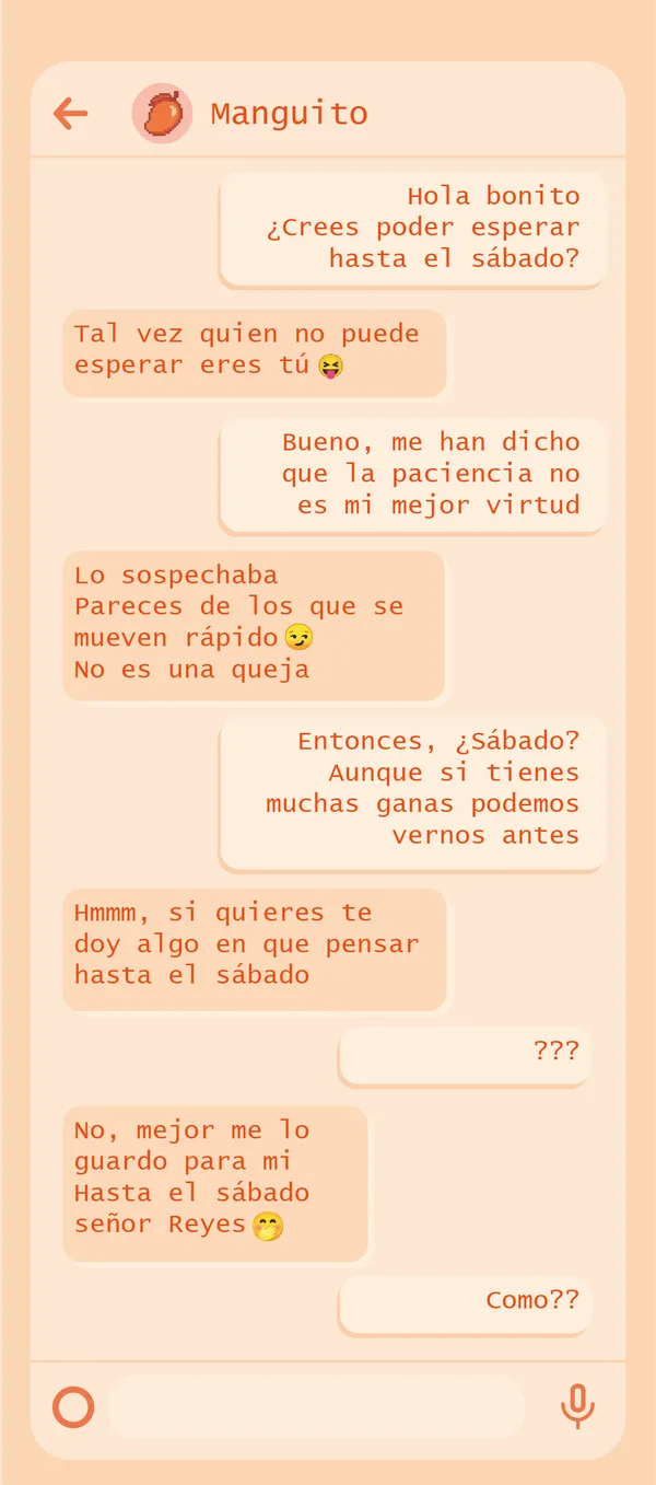 Estaba tentado a contestar con el mismo tono coqueto, pero se detuvo antes de escribir la primera palabra, su padre había sido muy claro, Manguito trabajaba en la misma empresa y no dudaría en despedirlo si se enteraba de que volvían a verse.
